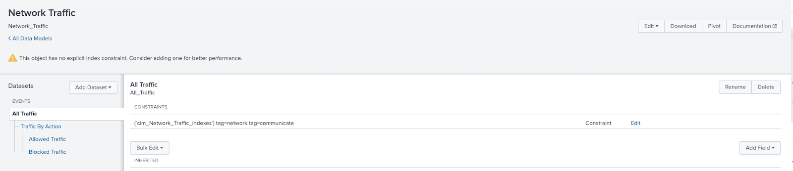 - Now let’s review how the CIM can map Netflow traffic fields contained at netflow_index to CIM:For that click on Datasets and filter by Network traffic: click con Network traffic > All Traffic: