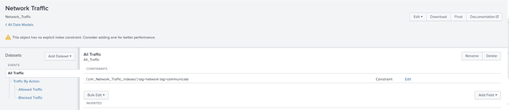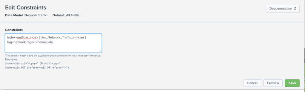 - Before configuring the acceleration of the data model I will add an index constraint to the data model. That is not necessary for a demo/dev environment but in a production environment I should set an index constraint to optimize performance of the data model acceleration. The default constraint will be: (`cim_Network_Traffic_indexes`) tag=network tag=communicate . I will click con Edit at the left of the constraint definition and set the constraint to: index=netflow_index (`cim_Network_Traffic_indexes`) tag=network tag=communicate so that the acceleration will only be made on the netflow_index. Then I will click on the Save green button.